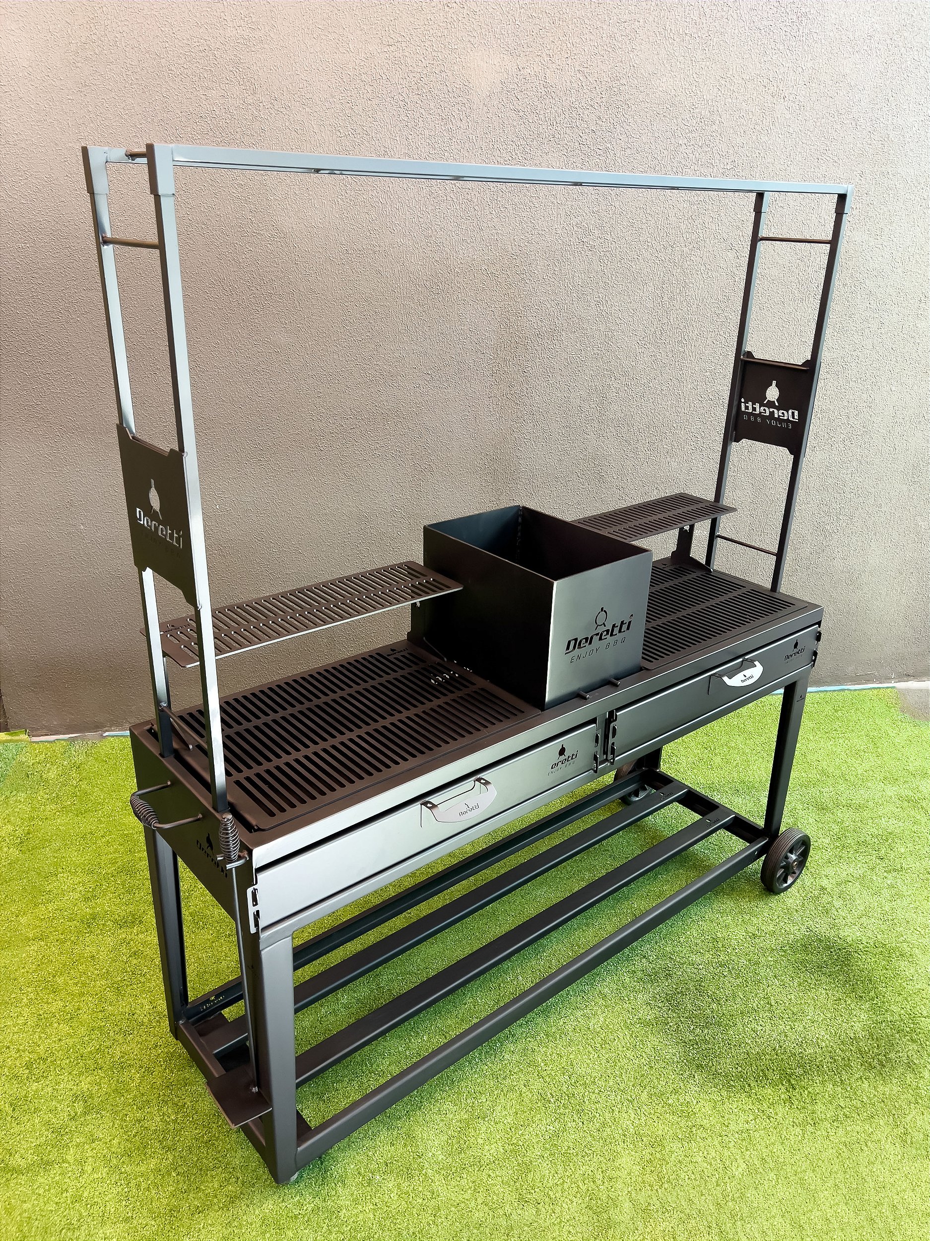 Grill duplo, firebox, base de apoio para espetos e varal